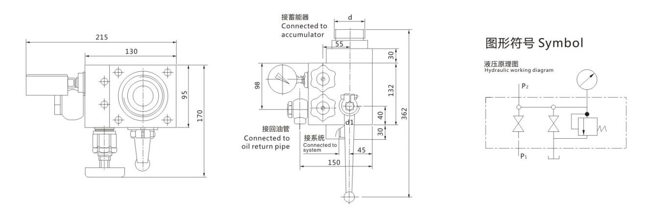 | Model | Nominal flow (Safety valve) (L/min) | Nominal flow (Ball valve) (L/min) | Connection size d (mm) | Connection size d1 (mm) | Matching accumulator (L) |